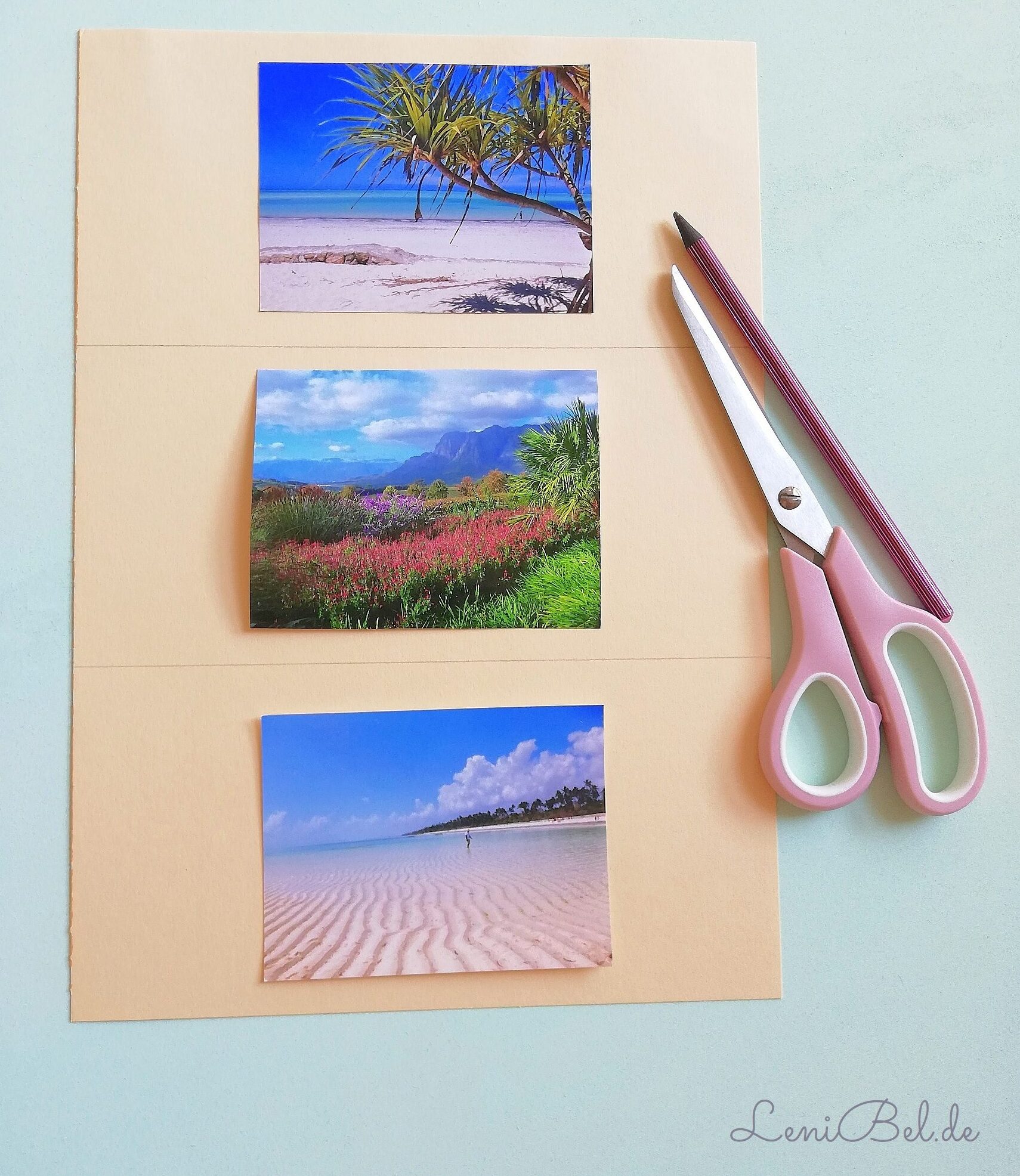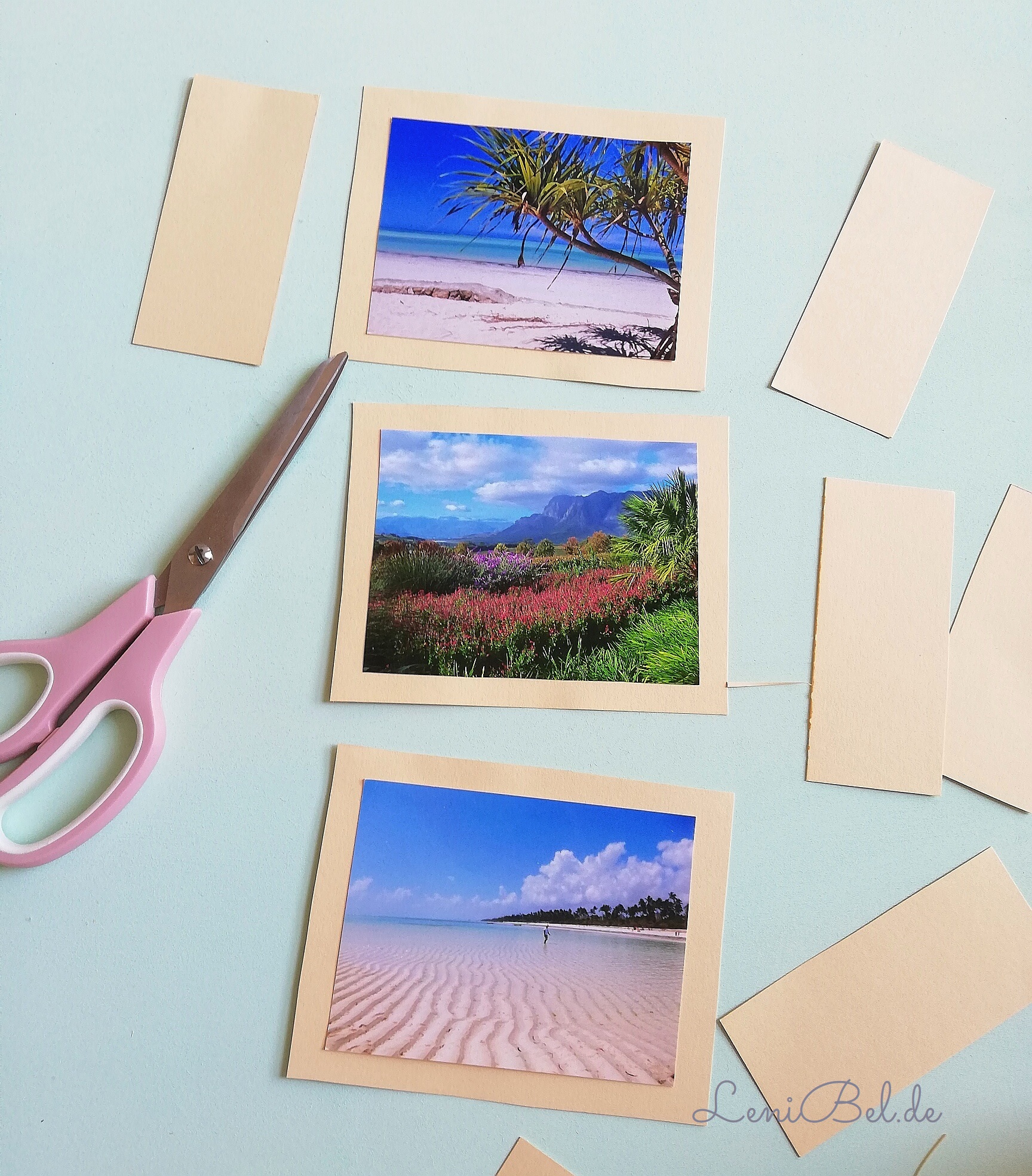 Im ersten Schritt sucht ihr Euch eure liebsten Urlaubsbilder heraus und einen farblich passenden Farbkartonbogen. Ich habe meine Fotos recht klein gewählt im Format 9 x 13cm. Je nachdem wie lang eure Treibholzstäbe sind, könnt Ihr die Größe der Bilder natürlich variieren. Schneidet nun den Farbkarton so zu, dass die Bilder jeweils einen schönen Rand von ca. 1-1,5 cm haben. Klebt die Bilder dann mit Fotokleber fest. Kleiner Tipp am Rande: wenn Ihr Fotoklebe-Ecken verwendet, dann könnt Ihr die Bilder auch jederzeit vorsichtig ablösen und mit anderen Bildern austauschen.  In der Zwischenzeit könnt ihr bereits die Heißklebepistole anstecken.