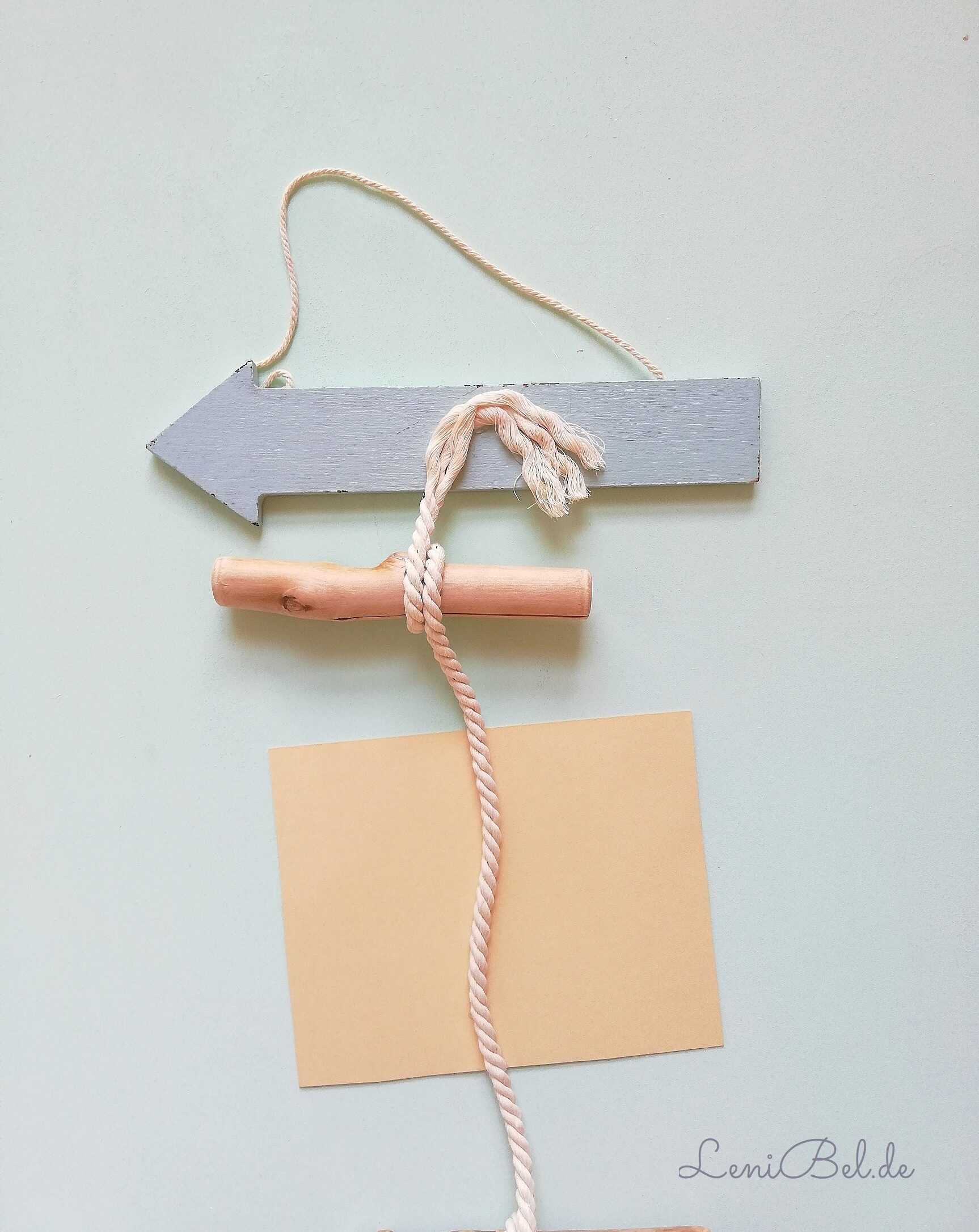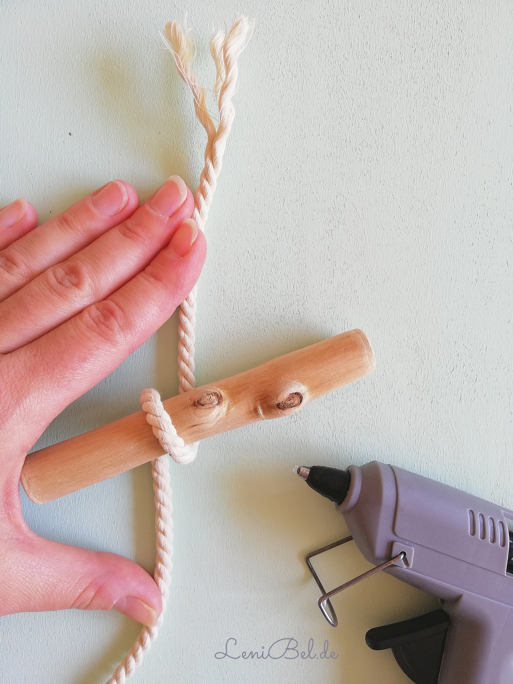Bereitet nun die Kordel vor und lasst die ersten 10-20 cm frei, je nachdem ob Ihr einen Anhänger möchtet (dann ca. 10-15 cm frei lassen) oder einfach später eine Schlaufe mit der Kordel bilden möchtet, an dem die Bildergalerie hängt (dazu nehmt Euch die ersten 20 cm der Kordel beiseite). Nun nehmt Ihr Euch das erste Stück Deko Treibholz und bringt den Kleber mit der Heißklebepistole mittig am Holzstück an. Legt sofort die Kordel darüber und umwickelt das Treibholz einmal. Drückt das ganze etwas an und lasst den Kleber kurz trocknen.