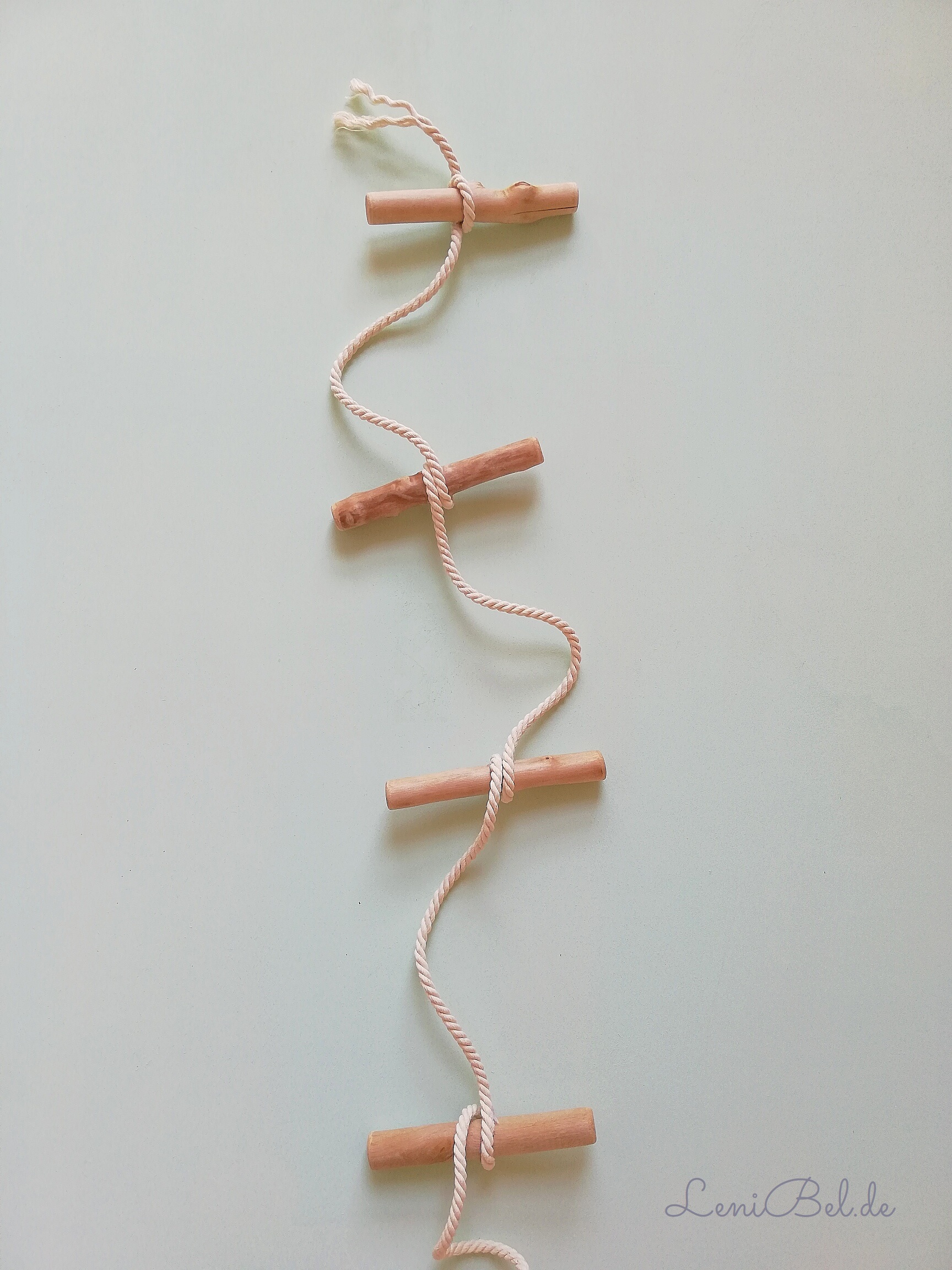 Jetzt lasst Ihr ca. 20 cm frei und umwickelt das nächste Stück Treibholz. Einfach so weiter verfahren, bis Ihr alle 4 Stücke Treibholz mit der Kordel eingebunden habt. Wichtig ist, dass Ihr die Schnur möglichst mittig am Holzstück anbringt damit es später grade hängt. Das sieht dann so aus.