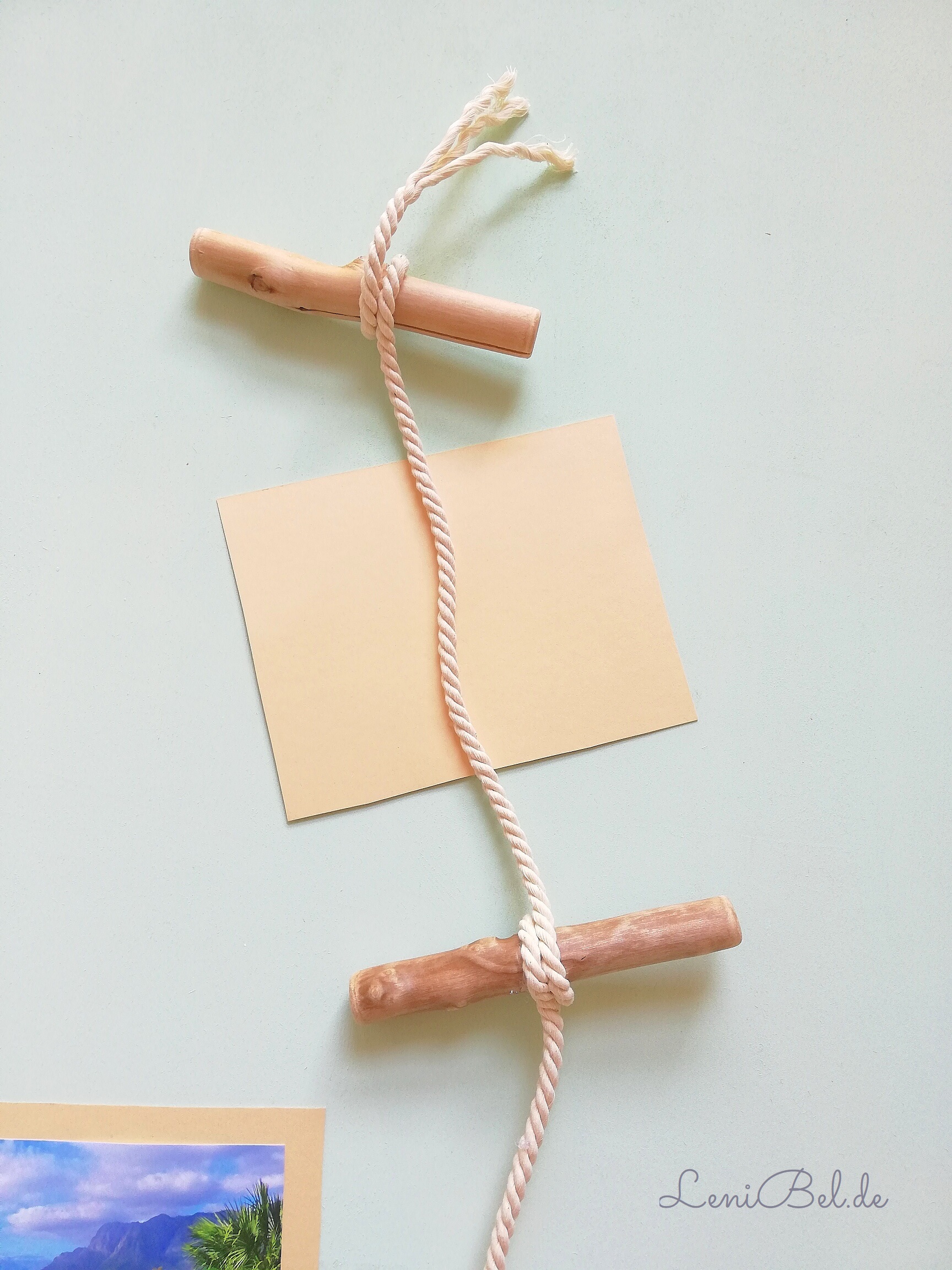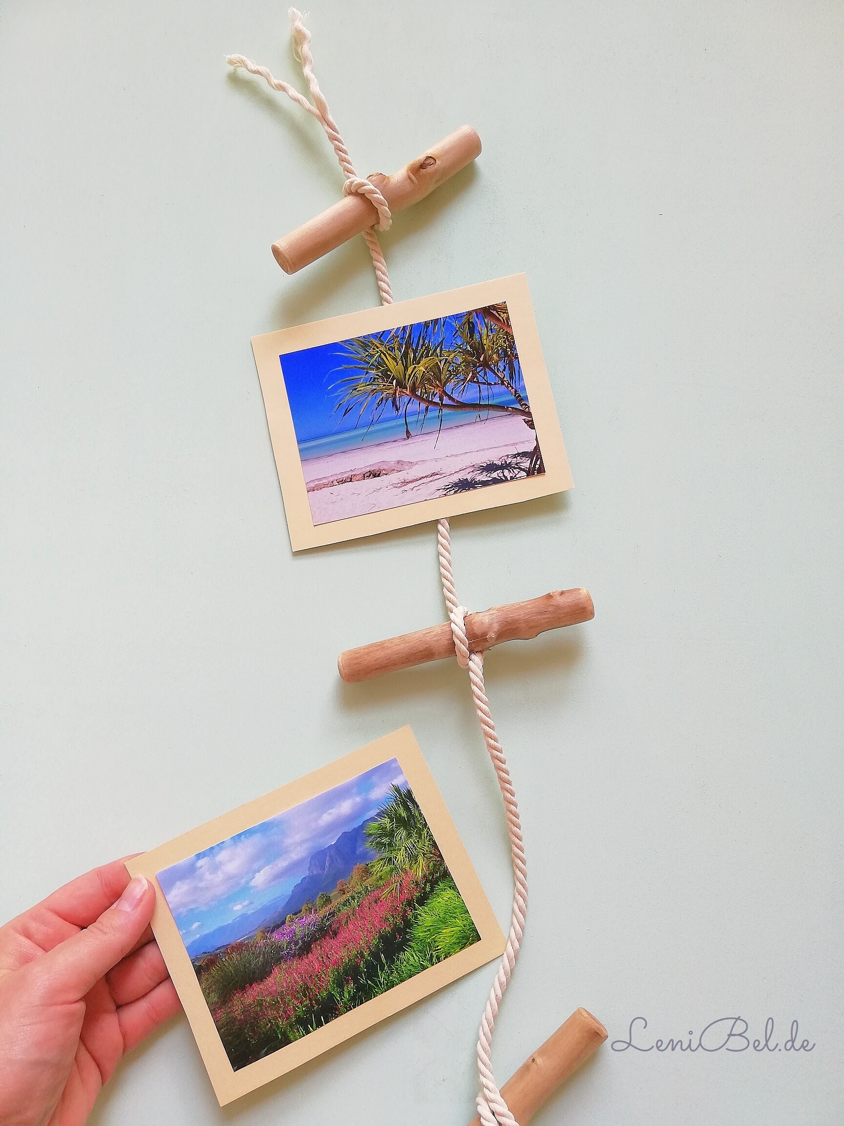 Nachdem der Kleber gut getrocknet ist, ist es Zeit die Bilder auf der Kordel zu platzieren. Dazu die Bilder in der Reihenfolge Eurer Wahl mittig zwischen dem Treibholz positionieren, und mit der Heißklebepistole ankleben. Auch hier wieder gut trocknen lassen.
