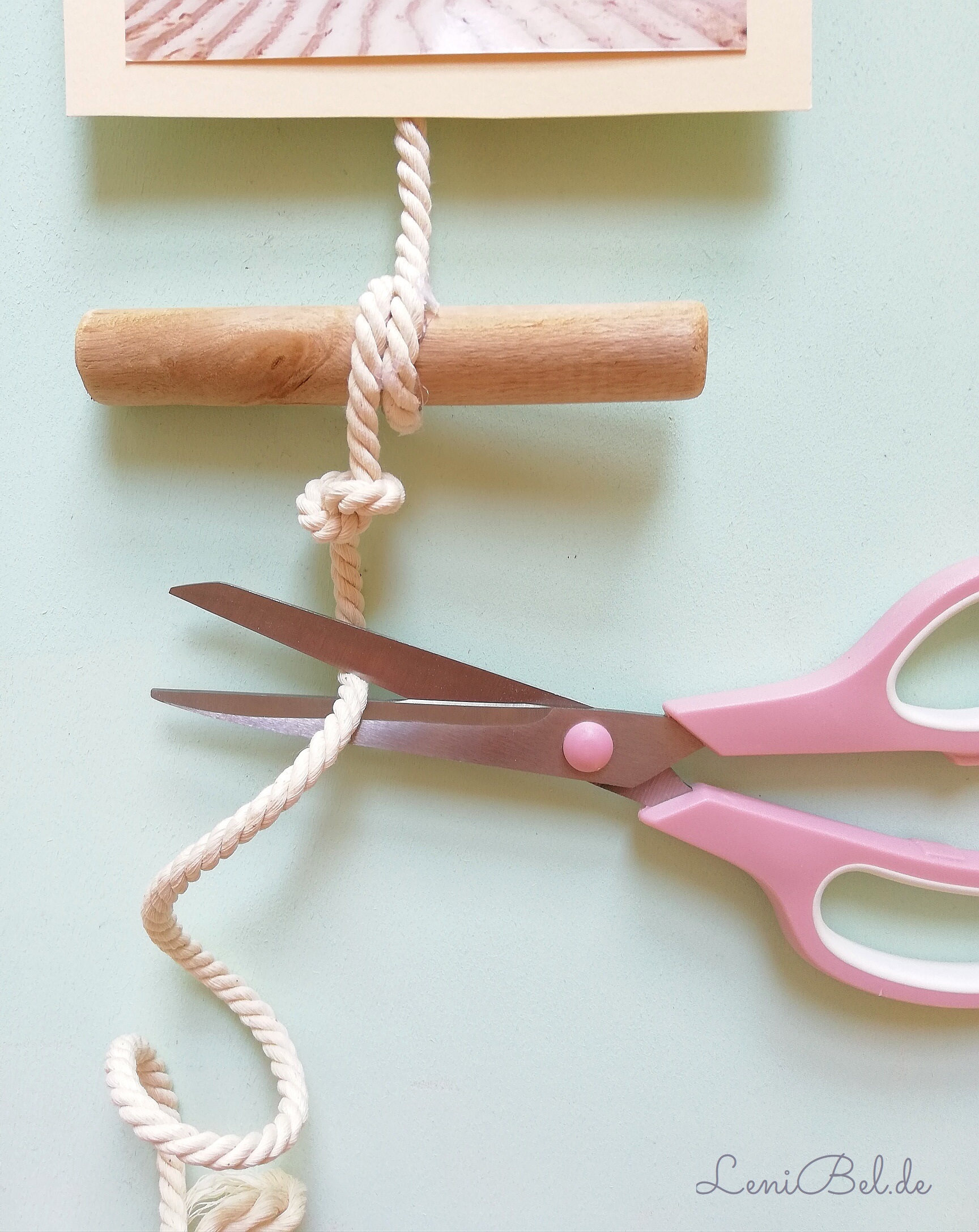 Zum Schluss macht Ihr unter dem letzten Treibholz-Stück einen Knoten in die Kordel und schneidet das Band ab, sodass die Enden etwas ausfransen. Am oberen Ende der Bildergalerie könnt Ihr nun entscheiden, ob Ihr einen Anhänger wünscht (ich nutze den Anhänger „seaside“ aus Holz) oder ob ihr hier die Kordel lieber zu einer Schlinge verknotet, auf der Ihr die Bildergalerie im Anschluss aufhängt. Hier sind Eurer Fantasie keine Grenzen gesetzt. Ihr könnt z. B. auch noch andere Elemente wie Muscheln oder Seesterne einbinden.