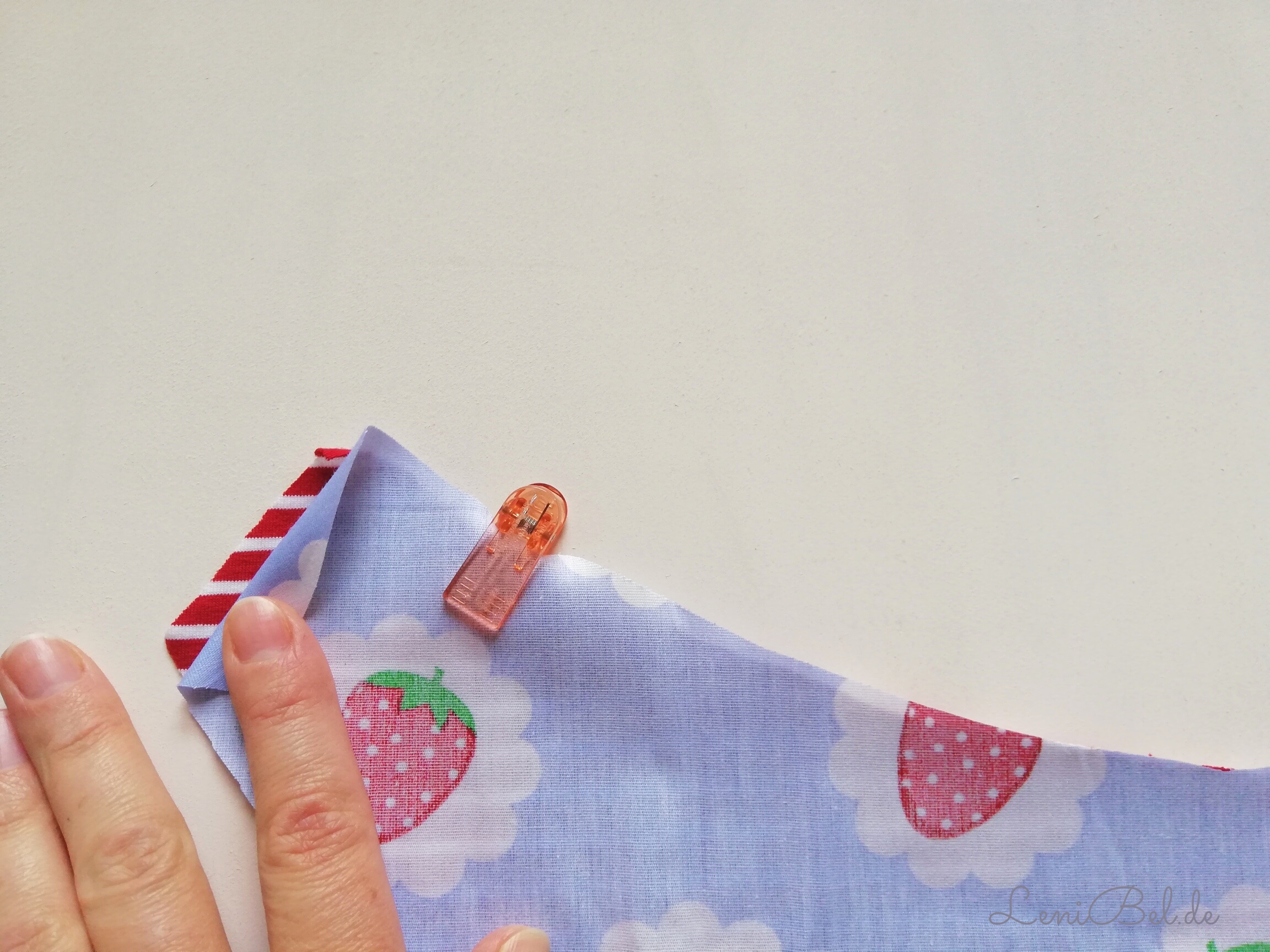 Nachdem du nun die Stoffe zugeschnitten hast, legst du beide Stoffteile rechts auch rechts aufeinander und steckst bzw. klemmst sie ringsherum fest. Nun bügelst du alles kurz über. Dann erst kommt das eigentliche Nähen. Dazu beginne an einer Ecke des Dreieckstuchs und nähe mit ca. 1 cm Abstand zur Nahtkante ringsherum. WICHTIG: lass an einer Verschlußseite des Dreieckstuchs eine Wendeöffnung von ca. 4cm.