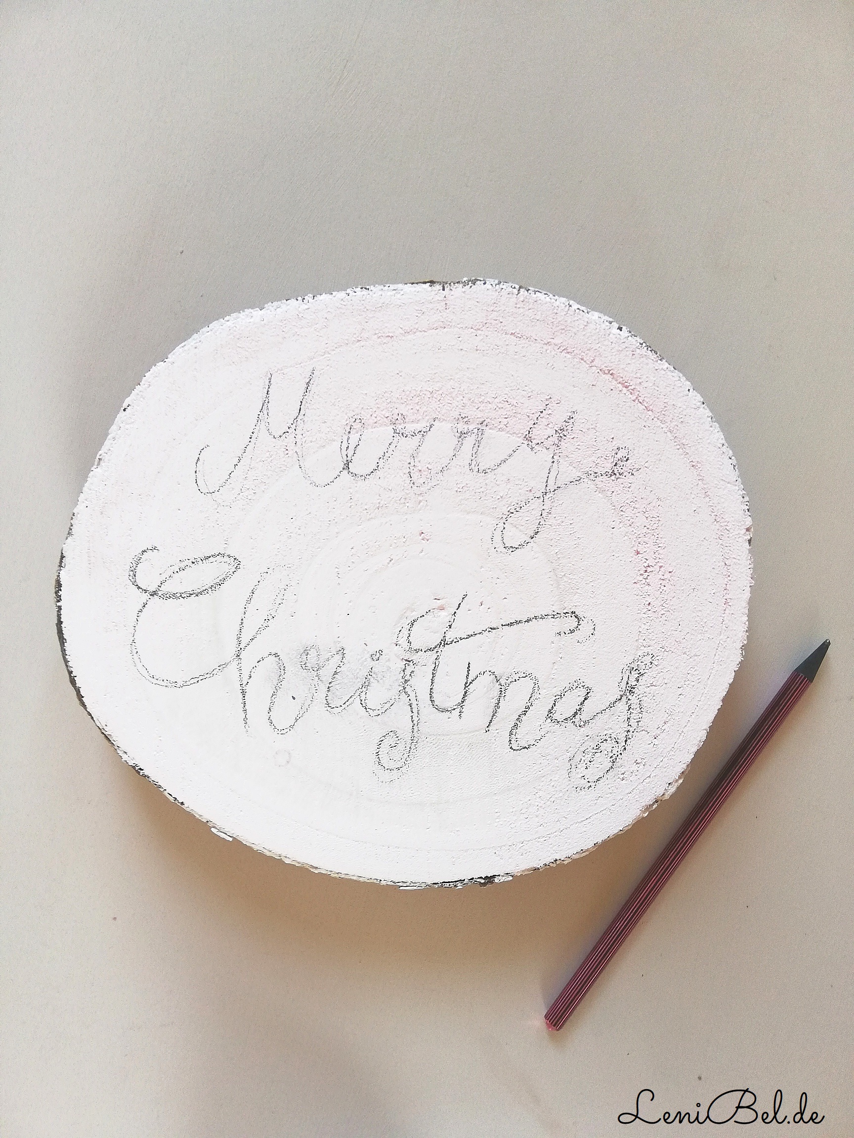 Lasst die Farbe mindestens 30 Minuten gut trocknen, bevor Ihr weitermacht. In der Zwischenzeit könnt Ihr Euch bereits überlegen, was Ihr auf das Holzstück schreiben möchtet, z.B. „Merry Christmas“, „Ho Ho Ho“, „Frohes Fest“, o.ä. Malt Euch das Lettering vorab auf einem Stück Papier auf und übt es ggf. ein paar mal, bevor Ihr es auf das Holzstück übertragt.