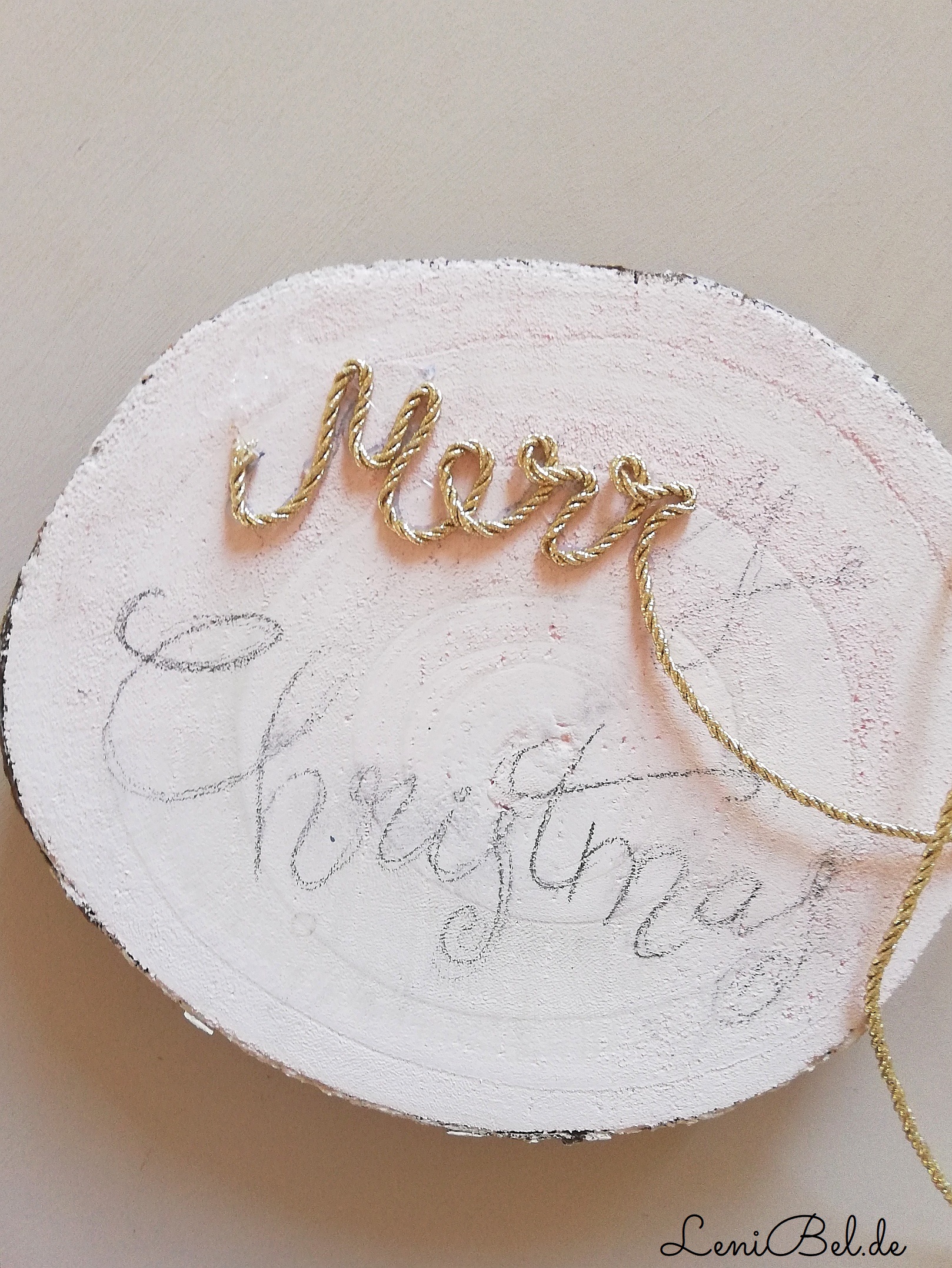 Wenn Ihr mit der vorgezeichneten Version zufrieden seid, wird es Zeit, die Heißklebepistole einzustecken. Fahrt nun Stück für Stück mit dem Kleber über die vorgezeichneten Buchstaben und drückt dann die Kordel darauf fest. Schneidet Euch vorab ein Stück Kordel ab, welches Ihr dann verarbeitet. Macht ruhig und langsam und nehmt euch immer nur einen Buchstaben nach dem anderen vor, da der Kleber sonst zu schnell trocknet.
